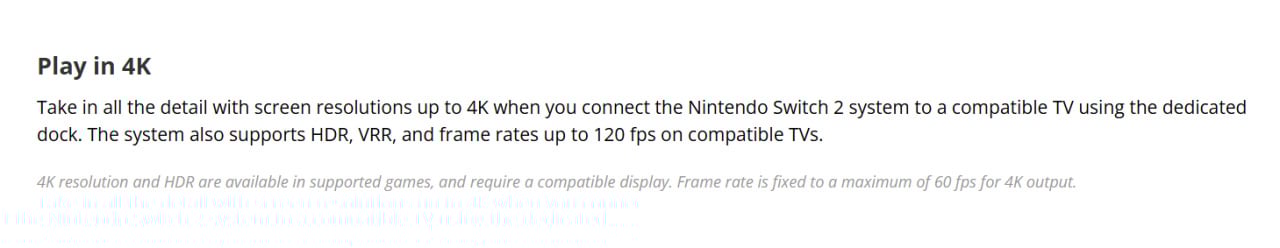 The Nintendo Switch 2 webpage in other regions like Europe still have "The system also supports HDR, VRR, and frame rates up to 120 fps on compatible TVs."