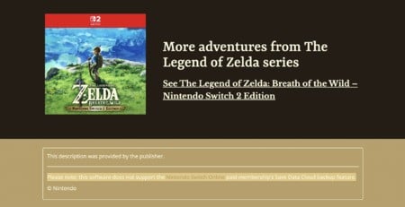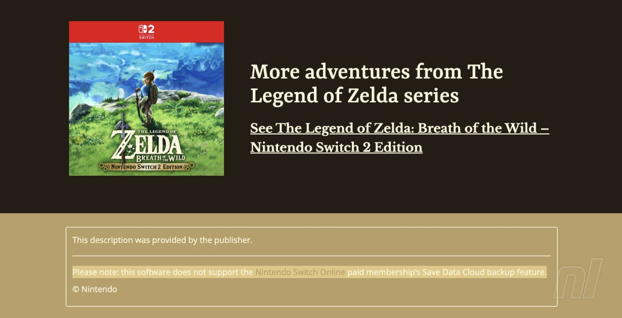 As was pointed out in a recent Resetera thread by user RandomlyRandom67, the Tears of the Kingdom Nintendo Switch 2 Edition page on Nintendo's website houses the following disclaimer: "Please note: this software does not support the Nintendo Switch Online paid membership's Save Data Cloud backup feature".